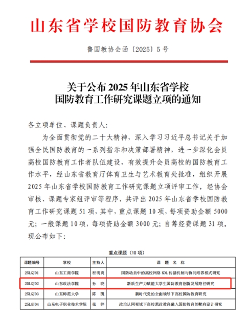 近日,山东省学校国防教育协会公布2025年度山东省学校国防教育工作研究课题立项名单,我校辅导员孙晓教师申报的课题获批重点课题立项。据悉,协会本年度全省共立项课题51项,其中重点课题10项。
