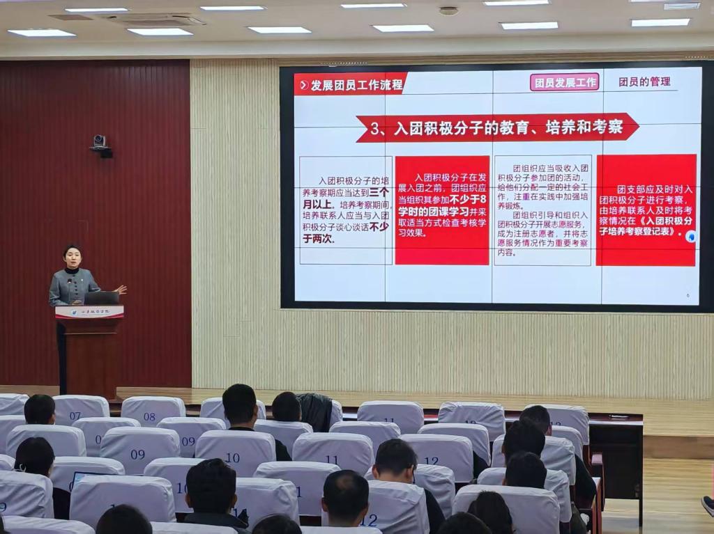 培训中,王亚静围绕基层团组织重点工作展开系统讲解,详细梳理了团员发展与管理的核心环节,从入团积极分子的培养考察到团员发展程序的规范要求,逐一进行精准解读;系统阐述了团组织生活与“三会两制一课”制度的规范落实要点,明确了各项工作的流程标准与质量要求。同时,她还就团员组织关系转接、团费收缴标准、团内标识使用规范及团纪执行等内容作了全面介绍,帮助辅导员准确把握政策要点。