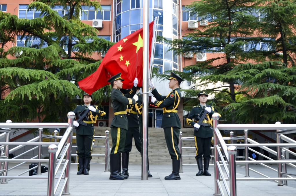 清晨,仪式在庄严肃穆的氛围中启幕。国旗护卫队迈着整齐有力的步伐护送国旗入场,激昂的《义勇军进行曲》奏响,五星红旗冉冉升起,全体师生庄严肃立、行注目礼并高唱国歌。