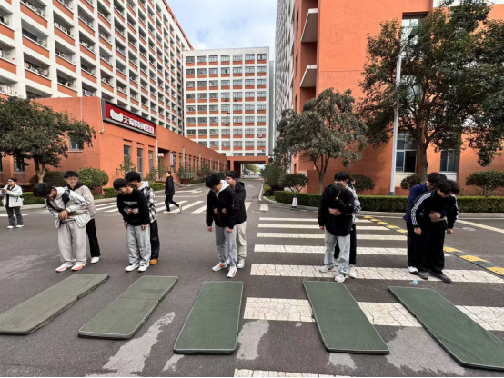 随着警报声响起,消防演练环节正式启动。各楼层负责人迅速响应、各司其职,同学们沉着冷静,用湿毛巾、湿衣物严密捂住口鼻,弯腰低姿沿着消防通道快速疏散,全程秩序井然,按照预设路线迅速撤离至指定安全区域集合。
