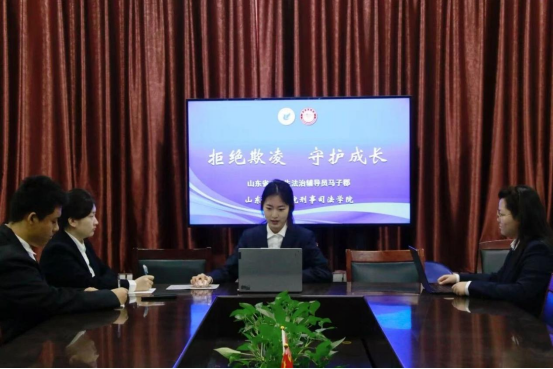 以法为盾,守护青春。为进一步强化大学生法治辅导员的普法职能,全面提升校园普法工作效能,用法治力量护航青少年健康成长,3月15日,刑事司法学院面向济南市莱芜陈毅中学,以线上会议形式开展“拒绝欺凌,守护成长”主题普法活动,依托线上平台打破地域壁垒,助力平安校园建设。